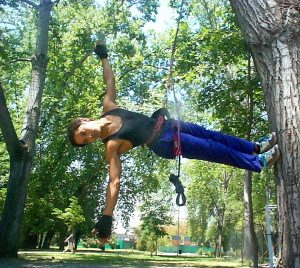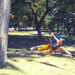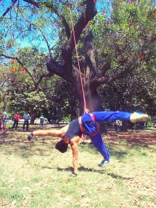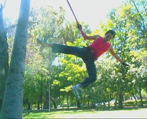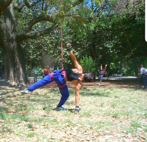 In 2004 I was part of an aereal dance workshop. We were dancing, jumping and walking on the trees at the Quinta Normal Park at Santiago de Chili, using ropes and elastic.